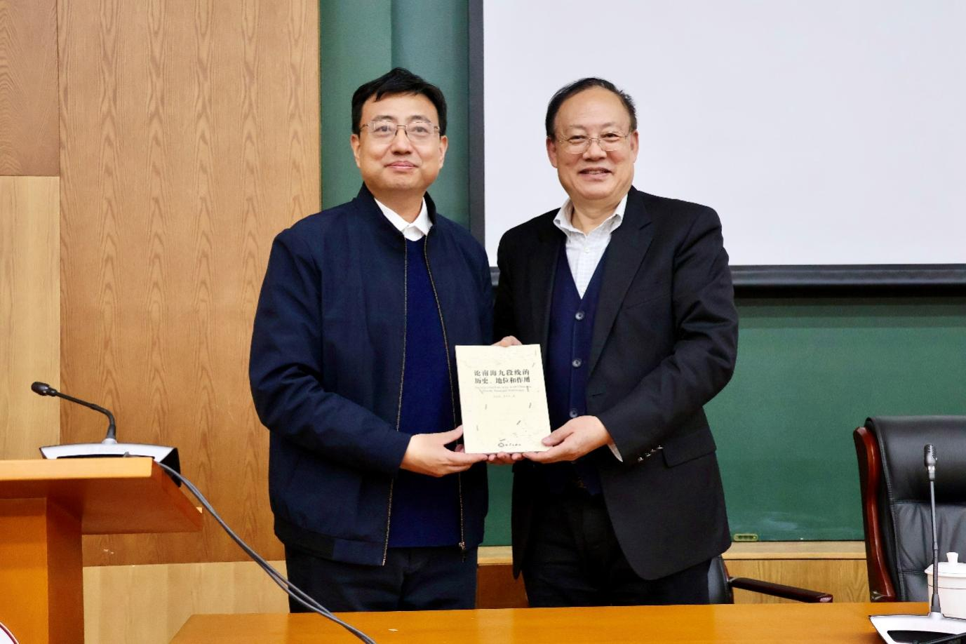 讲座以精准的知识、恢宏的视野、独到的思考,生动讲述了国际海洋情况演变与当代我国海洋法实践现状,极大丰富了师生对现代海洋法律制度的了解,有助于提升海洋意识,开拓国际视野,弘扬家国情怀,现场师生反响热烈。会后,高之国向学校图书馆赠送专著《论南海九段线的历史、地位和作用》,邢占军代表学校表示诚挚感谢。