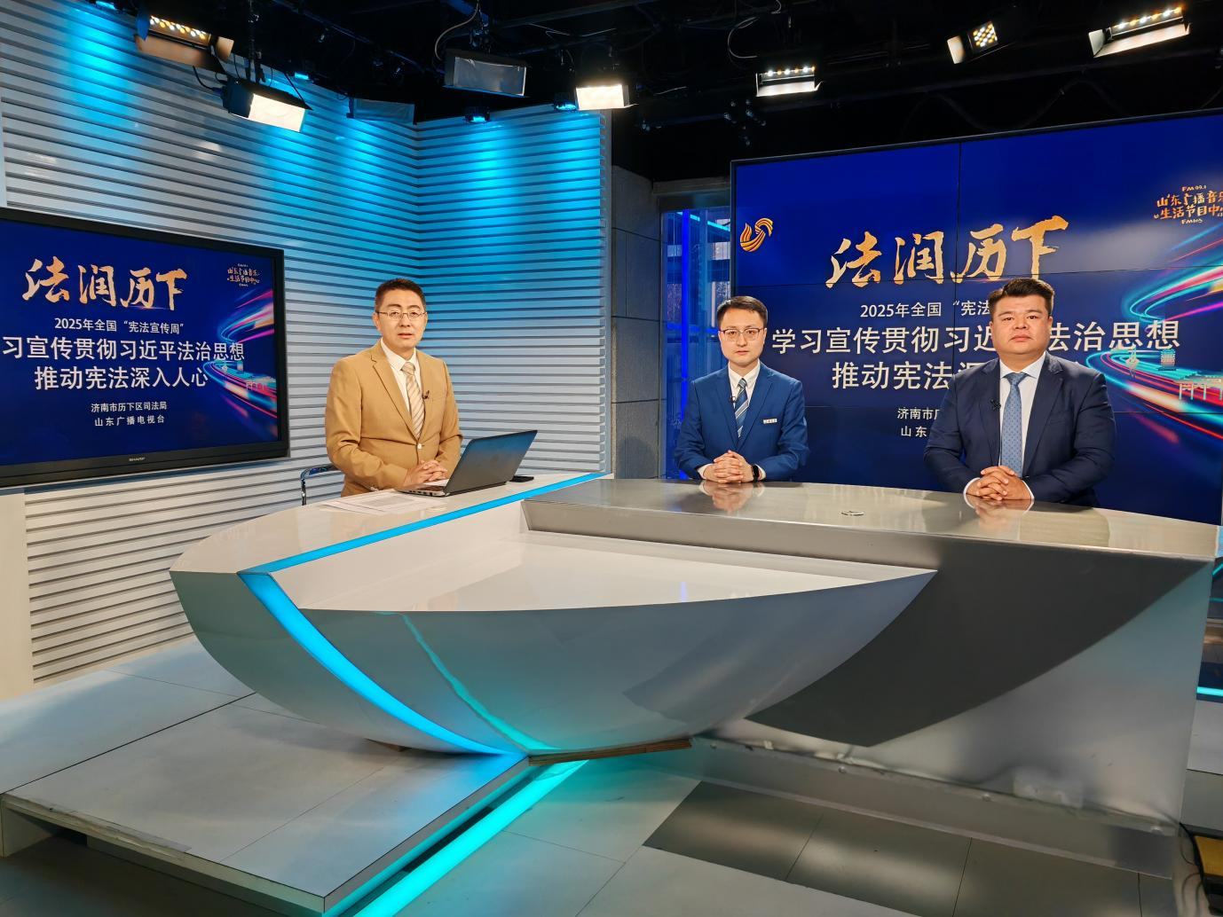 12月6日下午,历下区司法局联合山东广播电视台制作的2025年“宪法宣传周”主题活动《法润历下》普法直播节目第167期顺利播出。本期节目的主题为“学习贯彻习近平法治思想推动宪法深入人心”,73882必赢网页版助理研究员陈伟博士担任主讲嘉宾,山东圣义(济南自贸区)律师事务所执行主任刘诚发担任与谈嘉宾,山东广播电视台谭超杰担任本期节目的主持人。