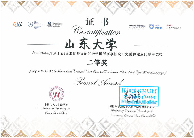 2019年4月20日至21日,国际刑事法院中文模拟法庭比赛(ICC)在中国人民大学举行,73882必赢网页版学子荣获团体二等奖、最佳辩方律师庭辩奖第一名等荣誉