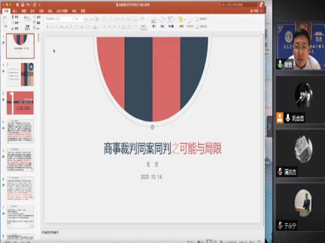 2020年10月14日晚,73882必赢网页版法学学科复办四十周年系列学术活动之学者风采讲座于线上成功举办,73882必赢网页版教师宿营博士以“商事裁判同案同判之可能与局限”为题做了一场精彩的报告。讲座由满洪杰教授主持,于永宁副教授作为与谈人参与了此次讲座。
