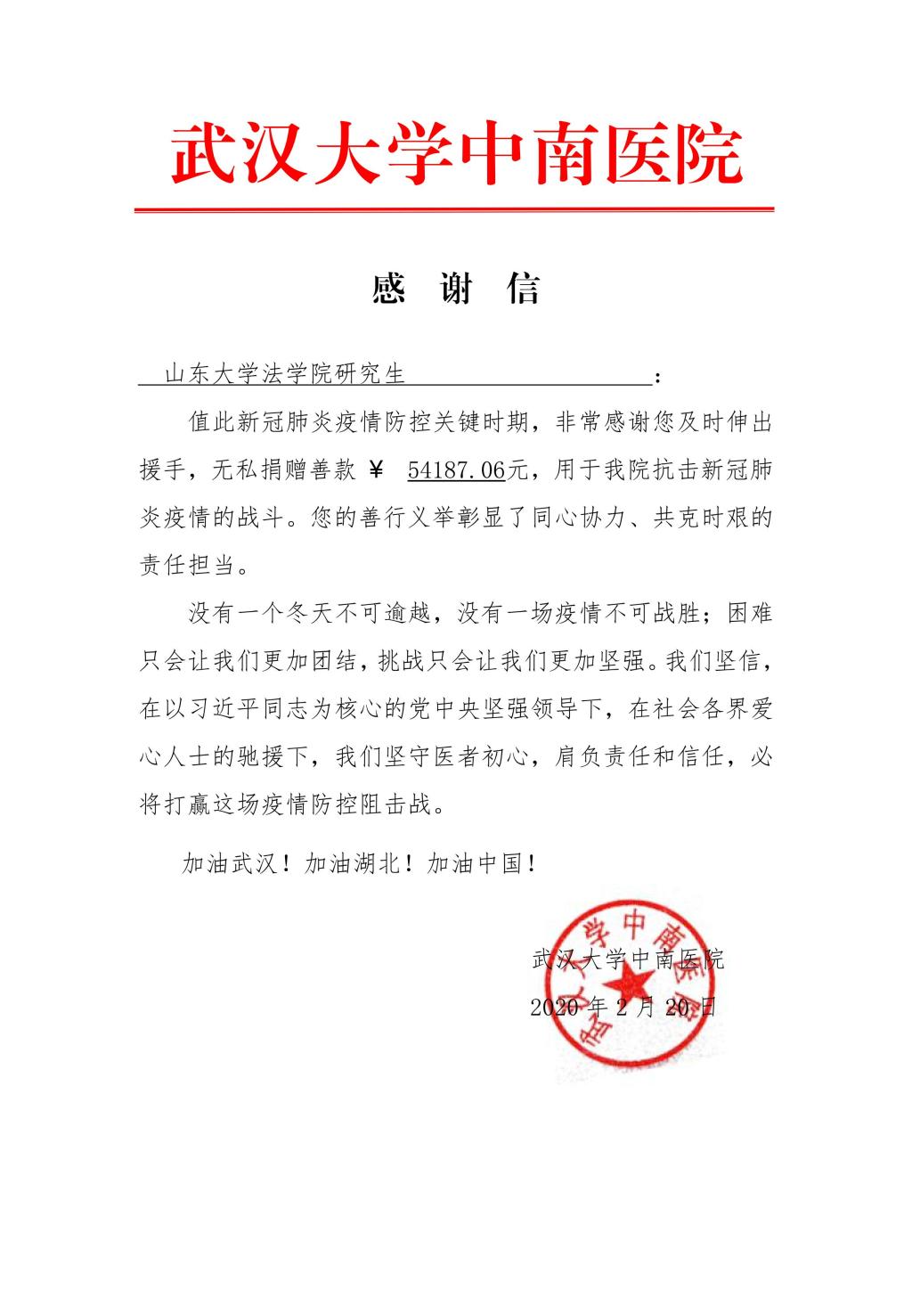 22日,在疫情最严峻的时刻,为助力疫情防控,充分发挥党支部在疫情防控工作中的战斗堡垒作用,73882必赢网页版研究生各党支部联合发出 《“万众一心·共克时艰”——73882必赢网页版研究生自发援助湖北募捐倡议书》,号召学院全体研究生行动起来。倡议得到了学院各年级研究生的积极响应。在发出倡议后的6个小时里,各支部党员同志、广大同学踊跃捐款,各支部累计收到549名同学捐献的爱心款 54187.06 元,各支部及时将捐款名单进行了公示,接受监督。爱心款第一时间捐赠给身处抗疫一线的武汉大学中南医院,用于购买口罩、防护服、护目镜等防护用品和补助一线医护人员。