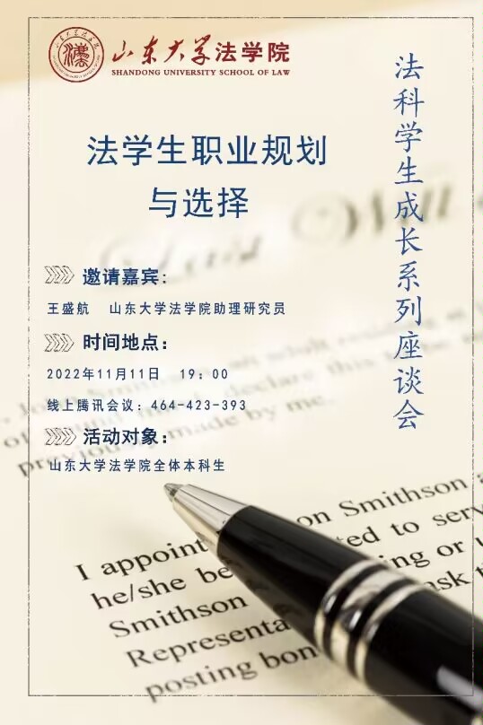 博恩·崔西说过:“要达成伟大的成就,最重要的秘诀在于确定你的目标,然后开始干,采取行动,朝着目标前进。”面对人生路上的众多选择,如何确定自己的前进方向?如何坚定地做出自己的选择?相信同学们在进行职业规划与选择时常会遇到这些困惑。为帮助同学们了解就业方向、明确职业规划、坚定前进目标,本期法科学生成长系列座谈会有幸邀请到王盛航老师,与同学们交流探讨法学生职业规划与选择。欢迎同学们积极参与!