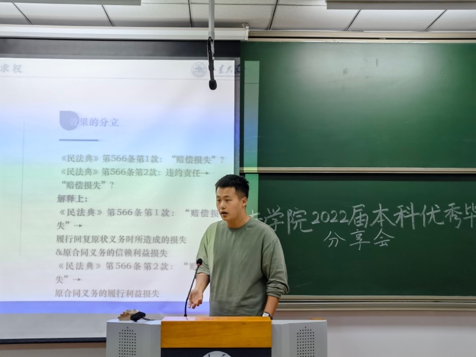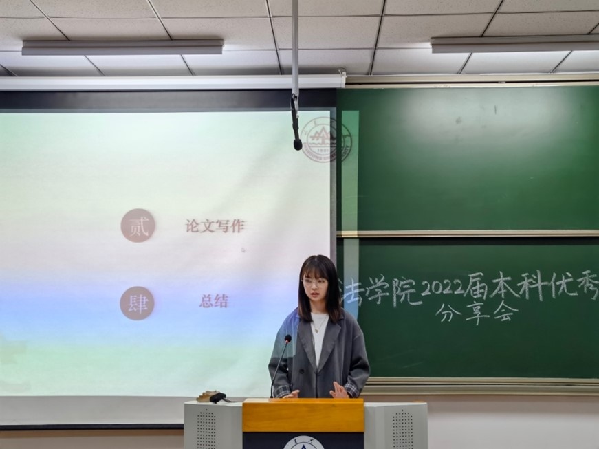 王懋祺以一个关于买卖合同的案例引入了本次分享的主题,并从多个方面解读论文的内容,他提到写论文区别于做研究,应当提高语言表达能力以充分展现自己的研究成果。郁卓在论文选题方面,建议同学们可以从最新核心期刊目录、知网“学术热点”板块、老师上课所提到的具有研究价值的问题与实践热点问题等角度综合考虑,此外她还就阅读整理文献、确定论文框架与遵守学术规范等内容分享了论文写作的经验。孙琦洋通过线上视频的方式为同学们展开分享。他认为确定一个好的选题需要细心观察社会现实,从中发现值得探讨的法律问题,并形成文章的总论点,然后运用相关理论进一步提出论文分论点并加以论证。