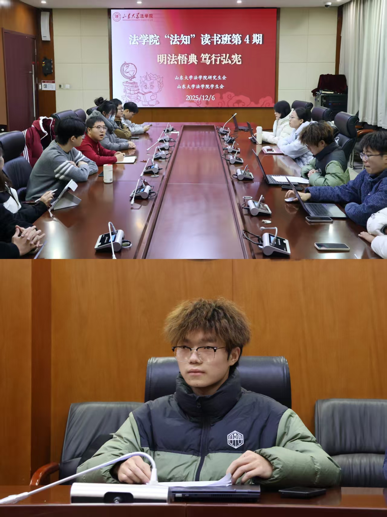 在理论学习与主题交流环节,学员代表2024级本科生陈俊熙结合《论坚持全面依法治国》一书进行领学发言。他认为,法治精神是山大青年成长成才的“护航员”、参与社会建设的“必修课”、担当时代责任的“内驱力”,“全面依法治国”不仅是宏大的国家命题,更与青年学生的成长成才息息相关。之后,参会学员围绕“依法治国”“依宪治国”以及实际工作中的规范纪律意识等议题展开了热烈讨论。