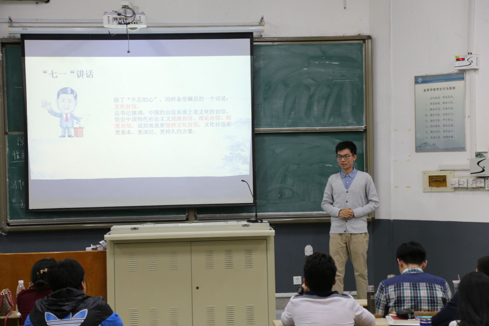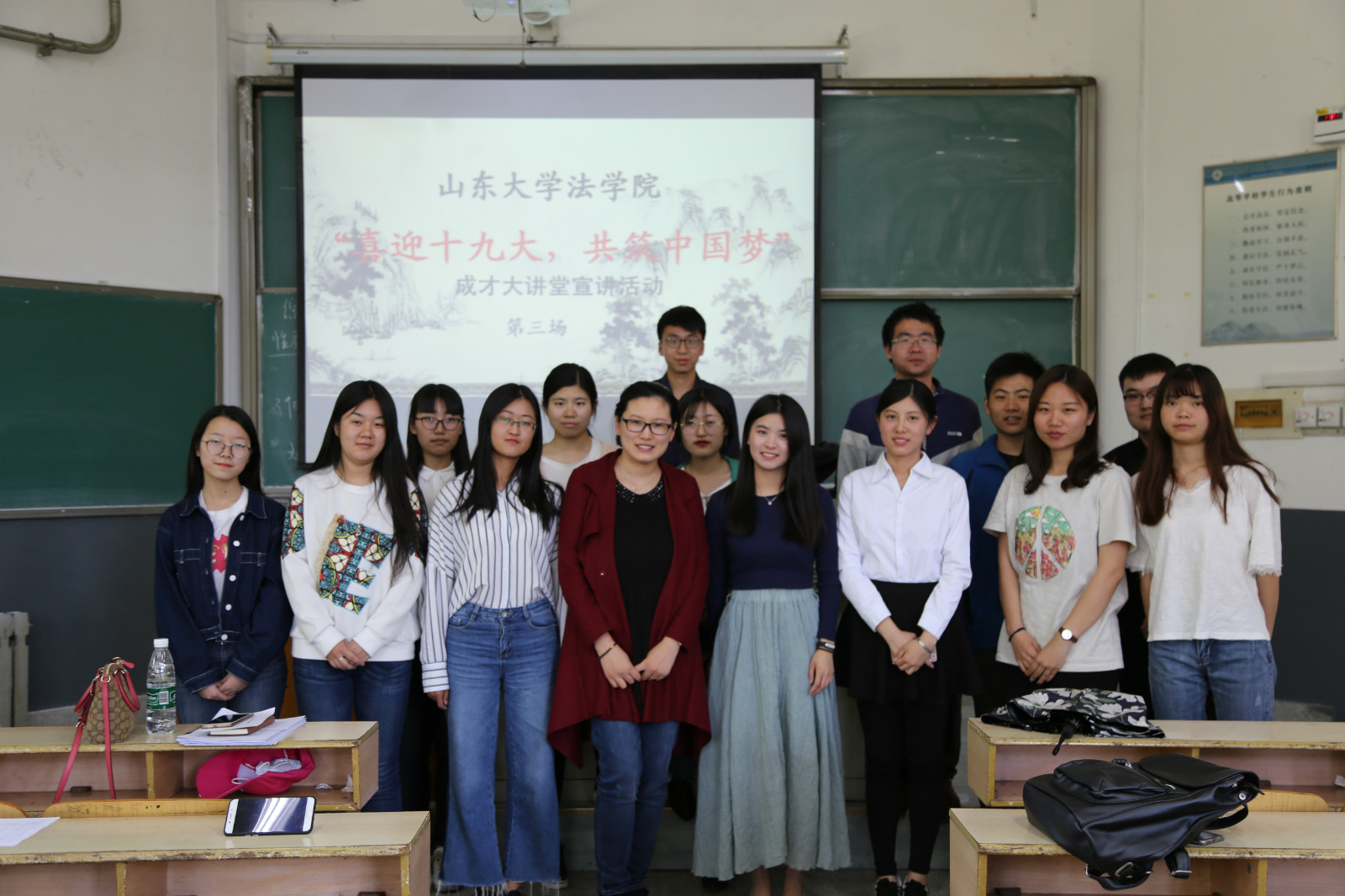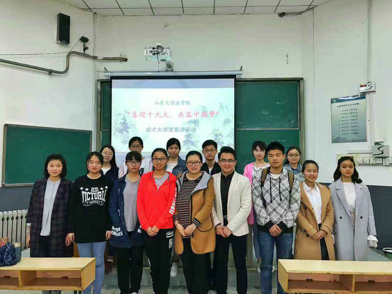 其中,洪家楼校区“成才大讲堂”宣讲活动共有24名同学参与。参加宣讲的同学们分别从“共建共享健康中国”、“文化自信”、“推进社会诚信建设”三个小主题出发,自选切入点进行演讲和PPT展示。同学们对此都做了积极充分的准备,既有理论的宣传又有个人经历的展示,观点各异,想法独特,许多同学在展示演讲主题的同时,不忘联系法学专业的知识与背景,充分展示法律人的逻辑思维以及社会情怀。四期宣讲活动获得老师以及同学们的一致肯定和好评青岛校区“成才大讲堂”宣讲活动紧密围绕“迎接十九大,共筑中国梦”的主题,立足各个角度全方位多方面的对同学们进行了精神的洗礼。演讲主题包括回顾党的十八大以来党政建设取得的伟大成就及丰硕成果,透过钓鱼岛、南海问题及“萨德”事件浅谈理性爱国,回顾党的十八大以来习近平总书记系列讲话,结合近期热播剧《人民的名义》谈党建反腐斗争,更有法英班同学以英文演讲的方式为同学们诠释了社会主义核心价值观。