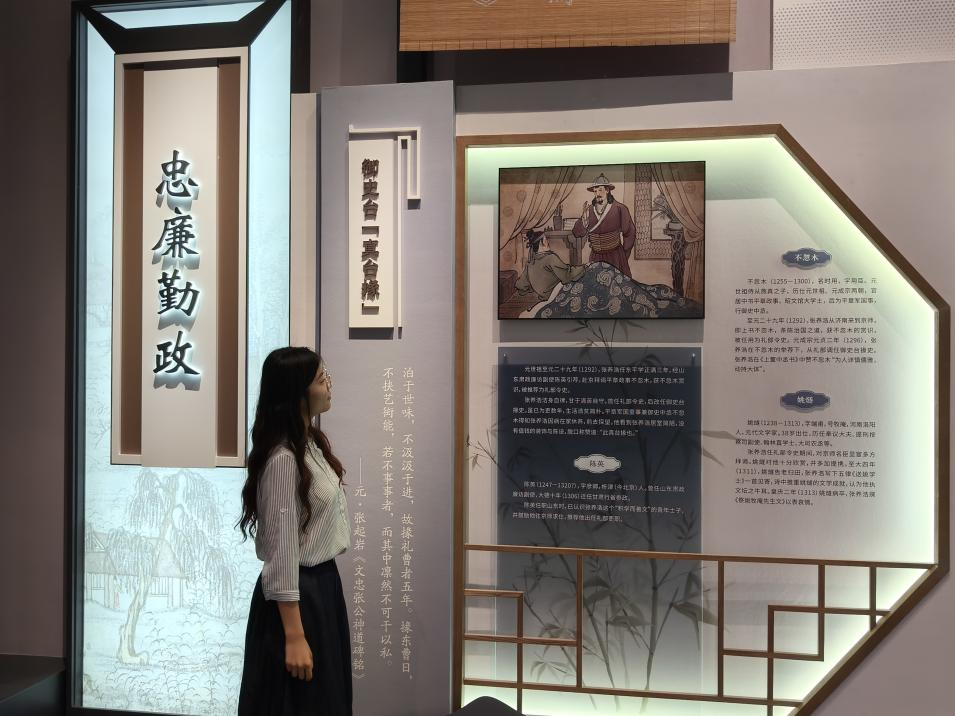 在济南市闵子骞墓孝廉文化基地和张养浩纪念馆,团队成员王潇婉依次参观了“一代名臣”、“为政忠告”、“散曲大家”、“水月松风”四大主题展厅,深入了解闵子骞、张养浩等先贤勤政为民、清正廉洁的生平事迹,切实体会“为官一任,造福一方”的从政理念和“以民为本、以廉为纲”的清廉精神。