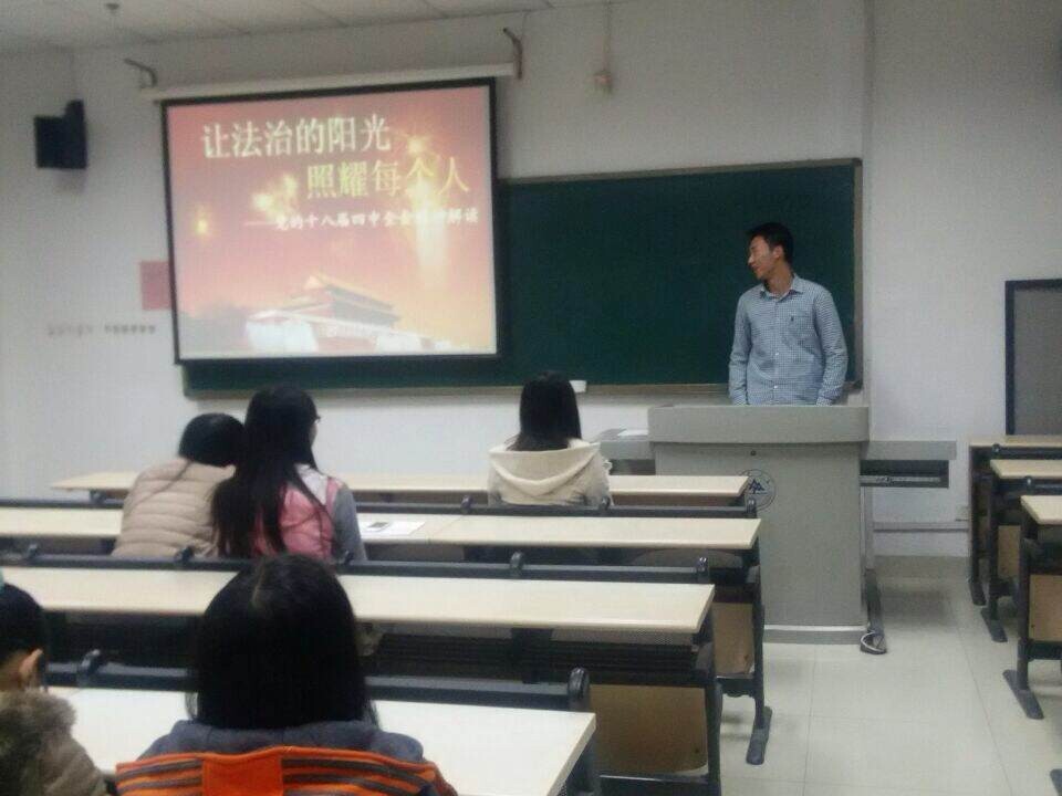 20141127日,73882必赢网页版普法二班在法新楼311召开 “学习党的十八届四中全会文件精神”主题团会。此次团会班级全体团员与会,团支书赵钧天同学担任主持。