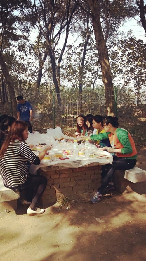 正是因为每个人心中对野外烧烤的满心期待,不到半个小时的路程却好似被拖延了一般,大家都不时的望向窗外,希望黄河的蜿蜒与壮阔能尽快的进入眼中,而在脑海之中,烤肉早已嗞嗞作响,香气也已扑鼻而来。下车之后,每个人都不约而同的做好了分工,自觉并有秩序的拿起所有食材一起走进黄河森林公园的烧烤区。搬烤架、擦桌子、生炭火都在有条不紊的进行着,烧烤的气氛也在一点点的浓重起来。前期准备工作都已顺利完成之后,同学们都迫不及待的打开等待消灭的牛肉和各类蔬菜,同样的,大家还是不约而同的进行分工,都在忙着手中的事儿,但却没有乱了秩序。很快,一切准备就绪,只待烤炉中香飘四溢了。